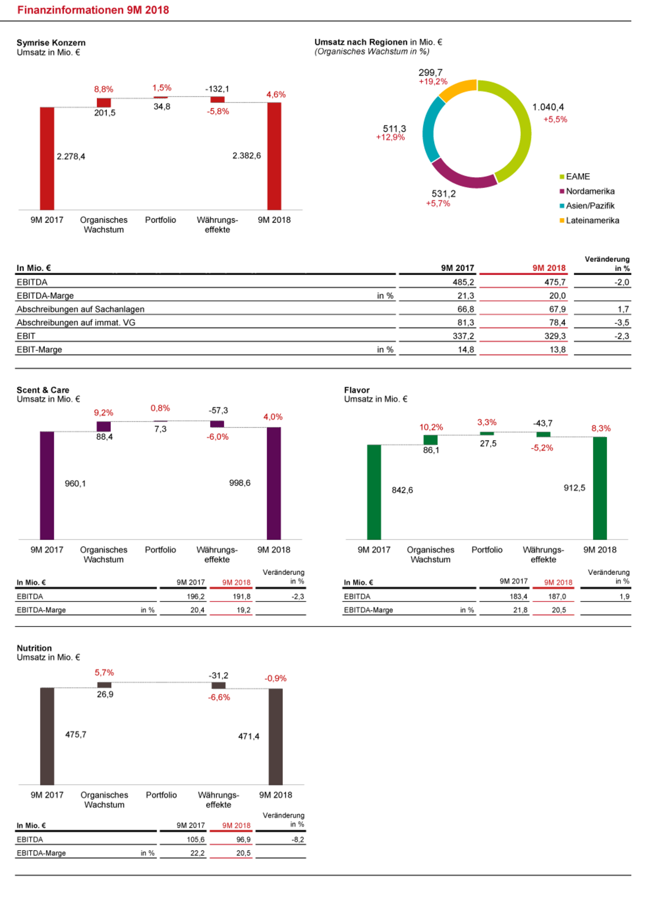 In den ersten neun Monaten steigerte Symrise seinen Umsatz währungsbereinigt um 10,3 %. Das organische Wachstum (ohne Akquisitionen) betrug 8,8 %. Unter Berücksichtigung von Portfolioeffekten, wie den Beiträgen der zuletzt erworbenen Gesellschaften Cobell und Citratus sowie von Wechselkurseffekten wuchs der Umsatz in Berichtswährung um 4,6 % auf 2.382,6 Mio. € (9M 2017: 2.278,4 Mio. €). Symrise zählte damit wiederholt zu den wachstumsstärksten Unternehmen der Branche. Alle Segmente und Regionen zeigten gute Nachfrage und trugen zu der positiven Geschäftsentwicklung bei. Wie bereits in den ersten sechs Monaten wurde die Umsatzentwicklung in Berichtswährung durch die unvorteilhaften Wechselkurse, insbesondere durch das Aufwerten des Euro gegenüber dem US-Dollar, beeinträchtigt.