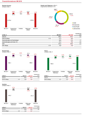 Scent & Care erzielte im Berichtszeitraum ein EBITDA von 191,8 Mio. €. Das Ergebnis lag vor allem aufgrund der gestiegenen Rohstoffpreise leicht unter dem Vorjahresvergleichswert (9M 2017: 196,2 Mio. €). Die EBITDA-Marge belief sich auf 19,2 % (9M 2017: 20,4 %).