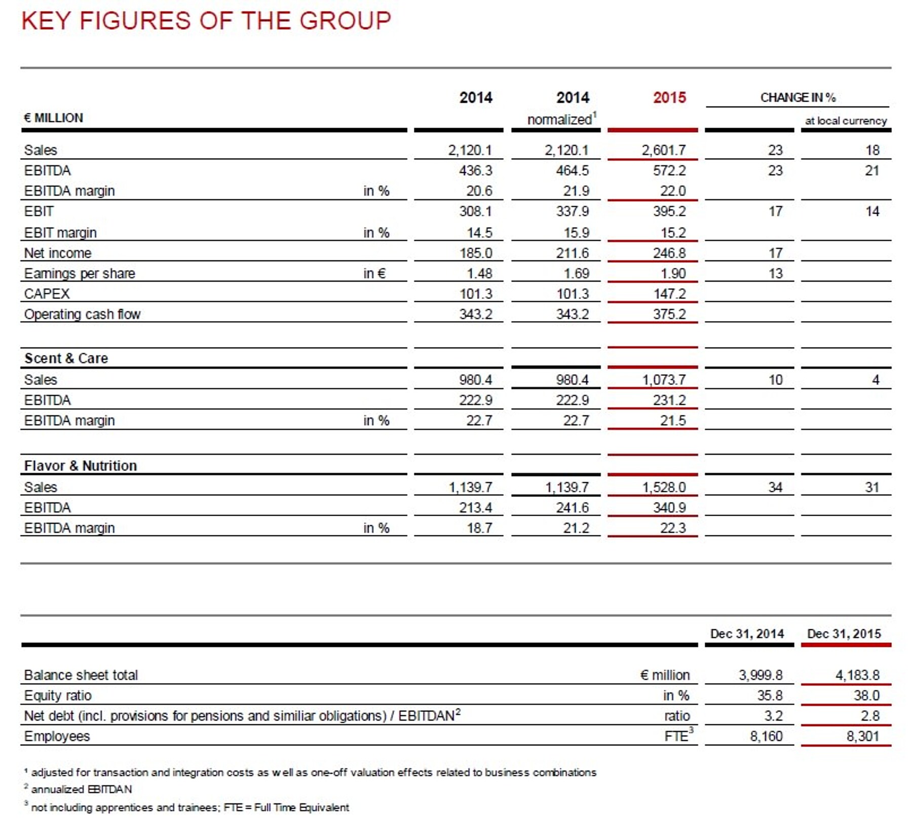 Symrise AG was once again among the fastest-growing and most profitable companies in its sector in 2015. The Group experienced strong demand in both segments and all regions and increased sales by 23 % (18 % at local currency) to € 2,601.7 million (2014: € 2,120.1 million). EBITDA also showed strong growth and rose by 23 % to € 572.2 million (normalized EBITDA in 2014: € 464.5 million). The EBITDA margin increased to an outstanding 22.0 % (2014 normalized: 21.9 %).