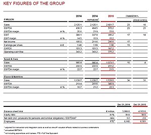 Scent & Care grew its EBITDA by 4 % to € 231.2 million (2014: € 222.9 million). The EBITDA margin remained high, at 21.5 %, despite additional expenses for research and development and marketing initiatives in the fourth quarter (2014: 22.7 %).
