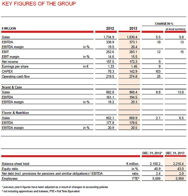 Symrise AG continued its dynamic profitable growth course in 2013 and achieved new all-time highs in sales and earnings during its tenth anniversary year. The Group grew sales by 6 % to EUR 1,830 million (2012: EUR 1,735 million). In local currency, this corresponds to an increase of 10 %. Earnings before interest, taxes, depreciation and amortization (EBITDA) also rose considerably by 10 % to EUR 373 million (2012: EUR 339 million). With an EBITDA margin of 20.4 % (2012: 19.5 %), Symrise managed to further increase its profitability this past fiscal year. These excellent developments were supported by both divisions. Scent & Care performed particularly well, benefiting from a positive consumer sentiment worldwide, strong demand for menthol and the fragrance activities acquired from the Belmay Group. Symrise recorded the strongest growth at local currency in North and Latin America. The group also continued to grow in the Emerging Markets and increased sales at local currency by 11 % compared to the previous year.